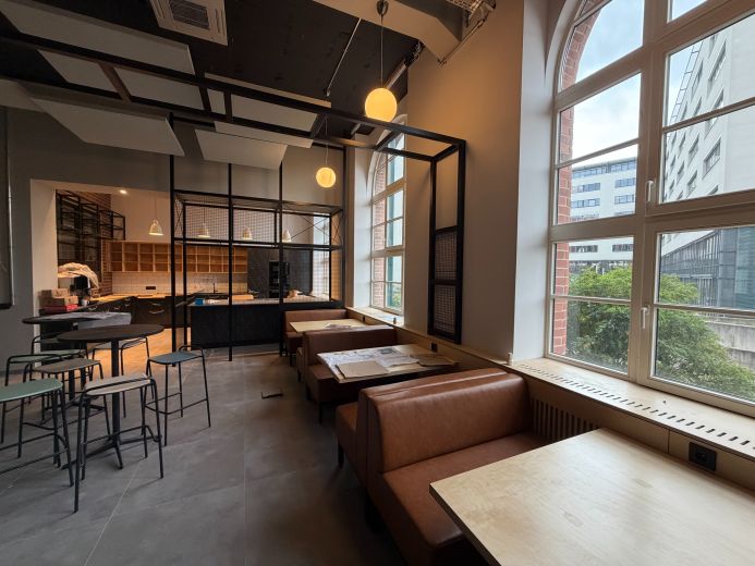 Ganz neue Möglichkeiten an alter Stelle. Bistro und Kantine für angenehme Pausen. Multispace und Open Office zum Arbeiten. Konfis und Telefonboxen um sich zurückzuziehen. Fotostudio für Audioaufnahmen und Videodrehs. Oder ganz kurz: Vieles von dem, was wir vorher nicht hatten. Einschließlich einer zweiten Ebene, wenn man mal den Blickwinkel verändern will.